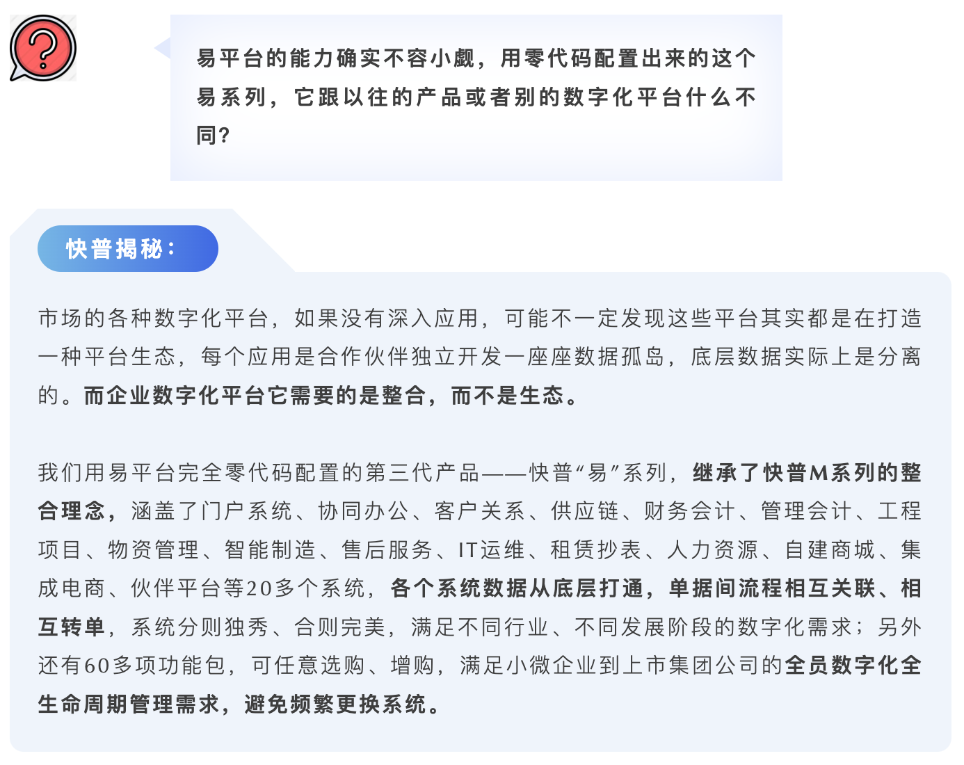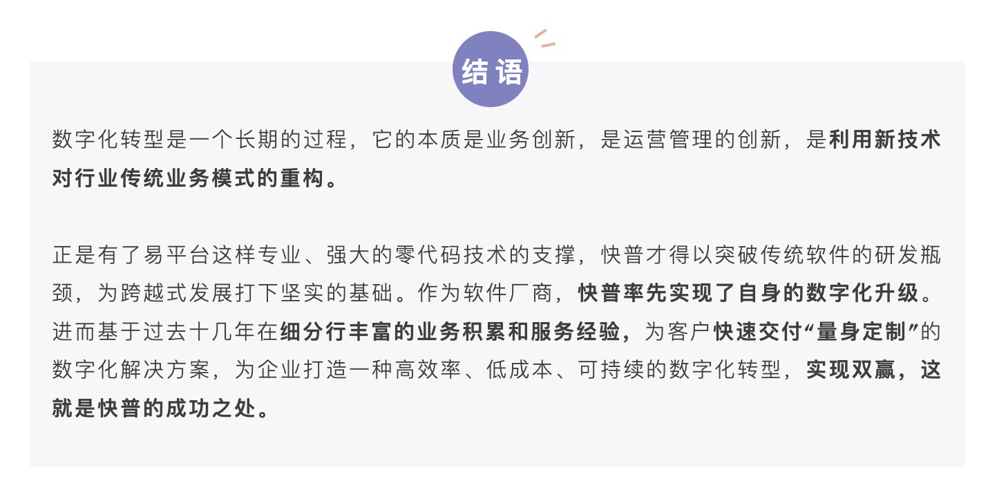 是的,我們可以很自信地說“快普零代碼平臺(tái)讓數(shù)字化轉(zhuǎn)型變得簡(jiǎn)單、可行”。這個(gè)是面對(duì)數(shù)字化轉(zhuǎn)型的所有角色而言的,包括我們自身軟件研發(fā)、實(shí)施交付,以及合作伙伴、用戶等,易平臺(tái)在效率、成本、技術(shù)門檻和可擴(kuò)展性等方面來說都有著顛覆性的突破,是非常有意義和必要的基礎(chǔ)設(shè)施??偨Y(jié)說有下面幾點(diǎn):